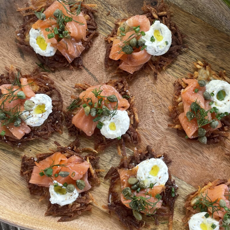 Mini-råraka med rökt lax, pepparot & kapris